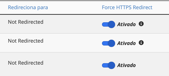 Após a instalação completa do seu SSL, recomendamos ativar a função “Force HTTPS Redirect”. Para acessá-la, clique em Domínios e ative a opção Force HTTPS Redirect. Dessa forma, todos os acessos ao site serão feitos via criptografia segura do SSL.