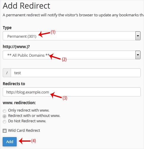 Em Adicionar redirecionamento , você deve inserir os seguintes detalhes e escolher as opções apropriadas.
