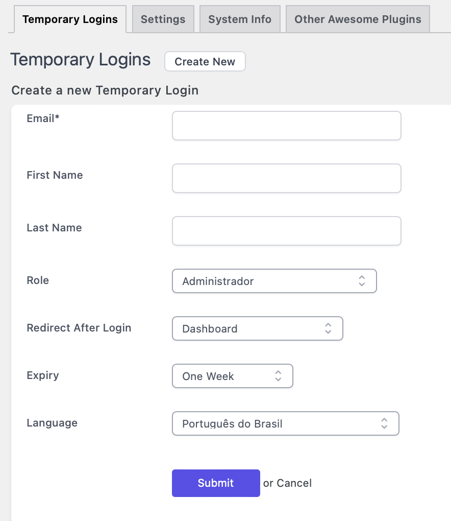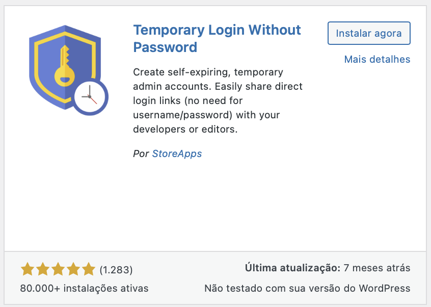 Busque por Temporary Login Without Password (por StoreApps), install e ative. Caso seu WordPress já tenha ele instalado, pule para "criar novo acesso".