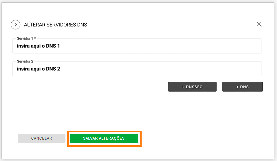 Confira os endereços de DNS em seu e-mail de boas-vindas da Up Server, copie e cole nos campos referentes e clique em Salvar Alterações.